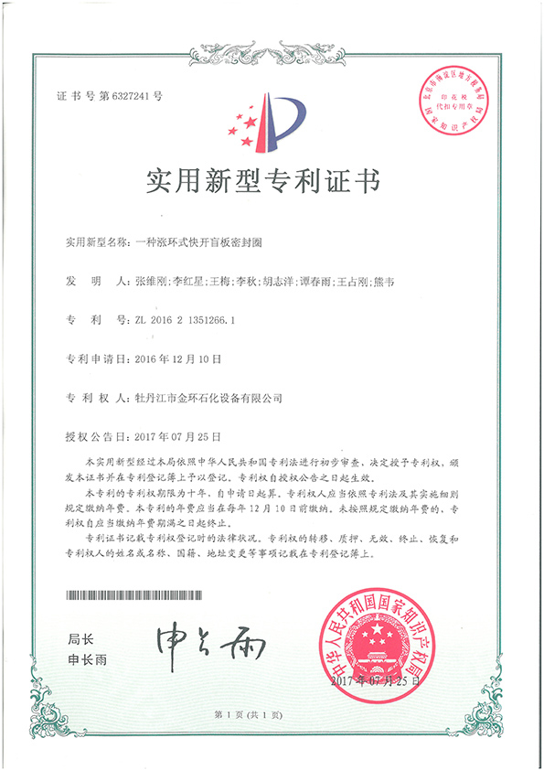 一種漲環(huán)式快開(kāi)盲板密封圈實(shí)用新型專利證書(shū)ZL 2016 2 1351266.1
